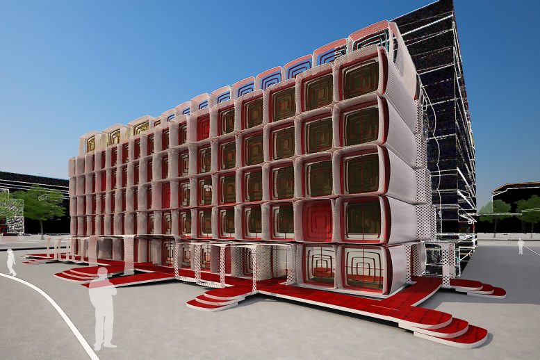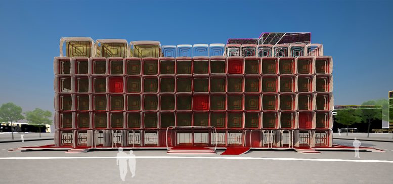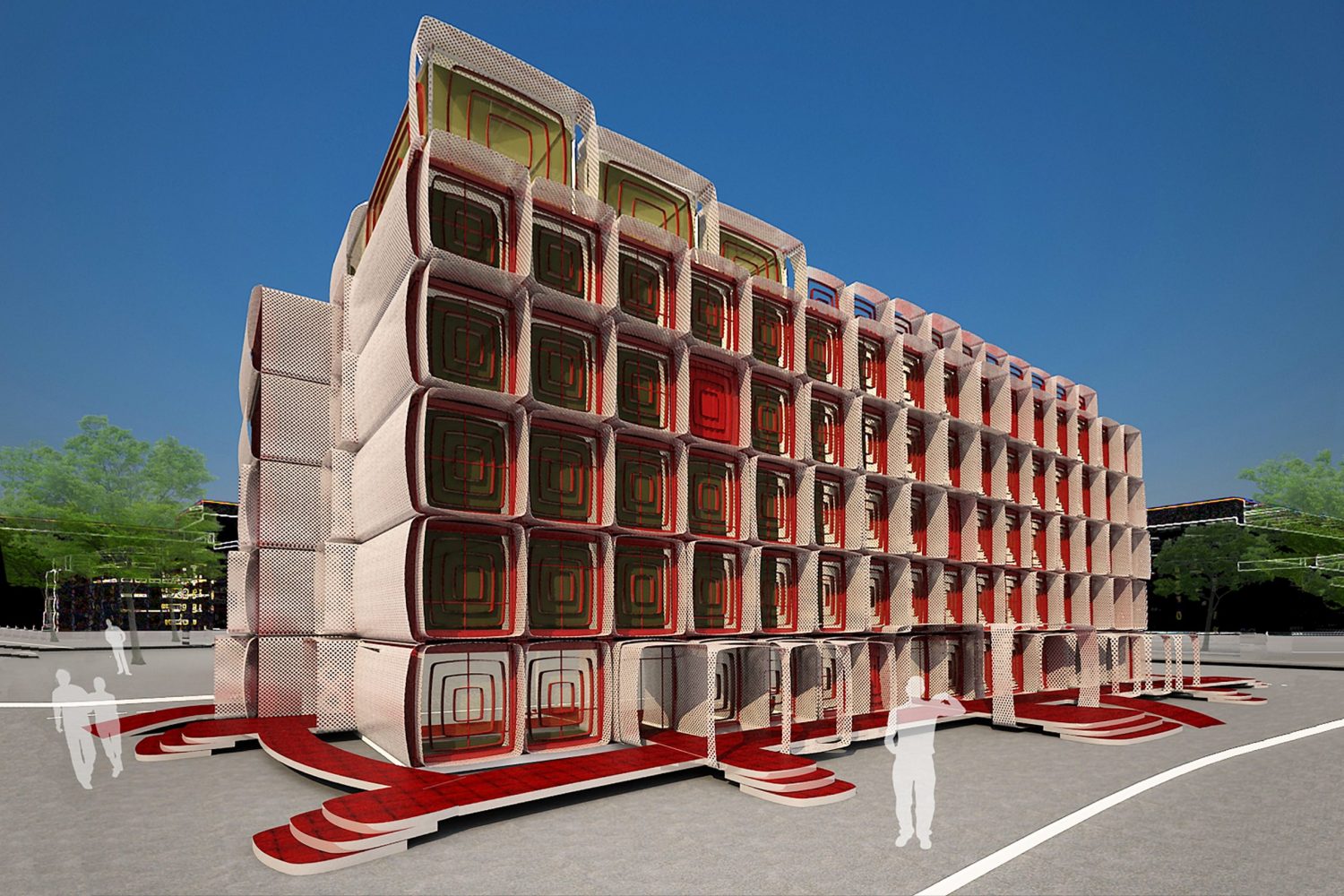 Architectural and interior design concept proposal for prefab container constructed, budget business class hotel.